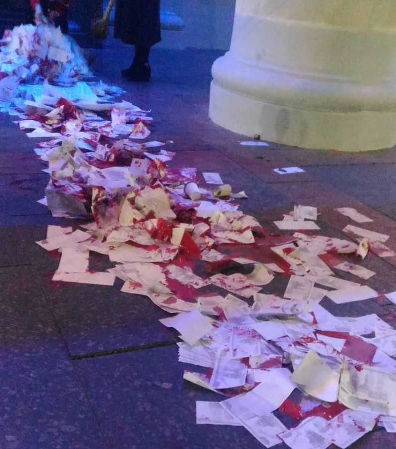 Как отмечается, перед входом в театр, где в 19:00 должен был начаться концерт певицы, несколько десятков активистов создали импровизированный «коридор позора». На лестнице они разбросали бумажки напечатанных российских рублей и залили их красной краской. Это, как объяснили противники Лободы, является символом того, что ее концерт проходит «на крови» украинских военных.