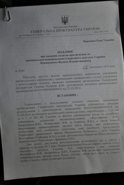 Также утверждается, что с сентября по декабрь 2013 года Новинский, будучи депутатом, был соучастником преступлений экс-президента Виктора Януковича, бывшего министра внутренних дел Виталия Захарченко и других.