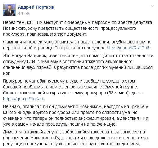 "Перед тем, как ГПУ выступит с очередным пафосом об аресте депутата Новинского, хочу представить общественности процессуального прокурора, подписавшего вчера этот документ. Фамилия интеллектуала значится в представлении, опубликованном на персональной странице Генерального прокурора. Это Богдан Нагирняк, известный тем, что помог уйти от ответственности сотруднику ГАИ, сбившему в состоянии тяжелого алкогольного опьянения двух парней, в результате после долгих мучений лишившихся ног", - сообщил Портнов.