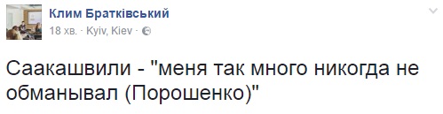 Саакашвили отметил, что в сложившейся ситуации уходит в отставку и начинает новый этап борьбы. Он пояснил, что последней каплей для принятия решения стали электронные декларации, в которых депутаты и чиновники указывали огромные суммы. Кроме этого, Саакашвили заявил, что президент Украины Петр Порошенко лично поддерживает коррупционные кланы.
