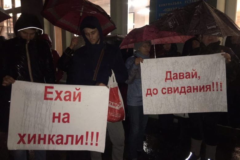 Одесситы пикетировали встречу Михаила Саакашвили с общественниками города. Люди пришли к зданию библиотеки Грушевского, где проходила встреча подавшего в отставку губернатора со своими сторонниками.