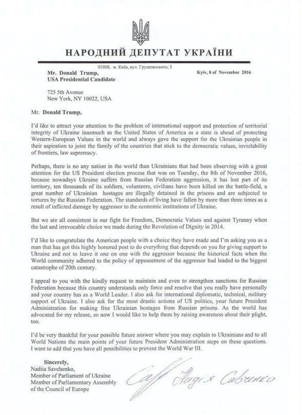 В документе, который обнародован на ее странице в Facebook, идет речь о санкциях против Москвы. В частности, Савченко просит американского миллиардера и новоизбранного президента США Дональда Трампа усилить санкции против РФ, а также предоставить техническую и военную поддержку Украине.