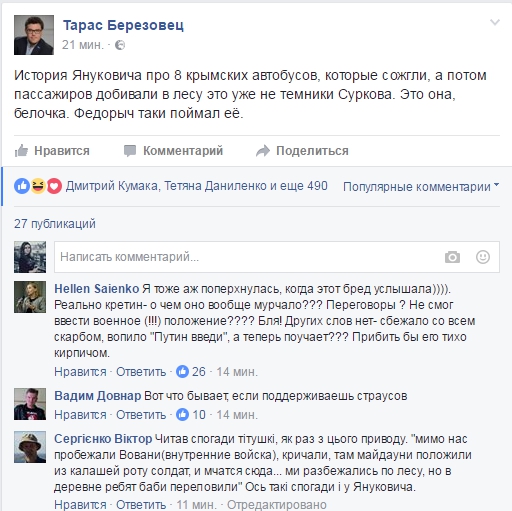 "История Януковича про 8 крымских автобусов, которые сожгли, а потом пассажиров добивали в лесу это уже не темники Суркова. Это она, белочка. Федорыч таки поймал её".