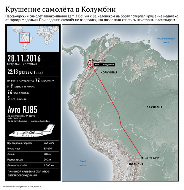 Во вторник, 29 ноября, в Колумбии потерпел крушение самолет с бразильскими футболистами, который вылетел в Медельин, и, скорее всего, врезался в горы.