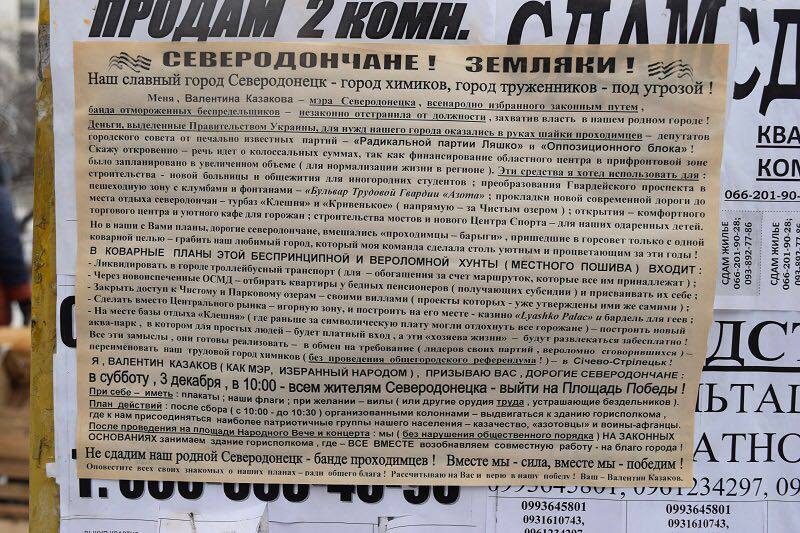 Так, в городе появились листовки, призывающие "наиболее патриотические группы населения - казачество, "азотовцев" и воинов-афганцев", захватить здание исполкома. Подписаны эти листовки, якобы городским головой. Вот только сам Валентин Казаков утверждает, что не имеет к ним никакого отношения. А распространение листовки и организацию провокаций приписывает местным депутатам, которые ранее были замечены в сотрудничестве с "ЛНР" (представителям БЮТа, РП и Опоблока), сообщает "ДС" со ссылкой на prav-da.com.ua.