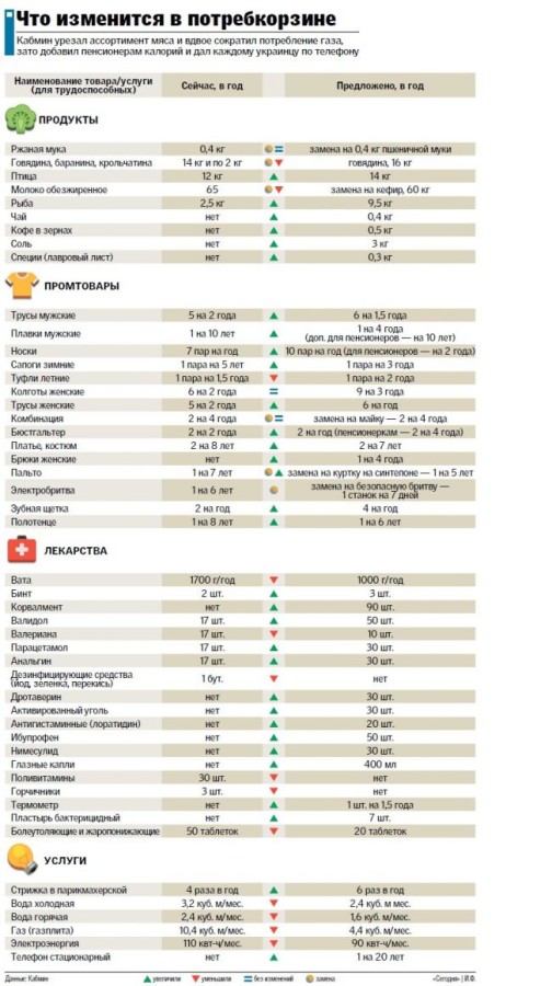 ЩО В КОШИКУ НОВОГО. Як видно з інфографіки, головні зміни торкнулися ліків, їх перелік тепер набагато більший. Значно зросли норми споживання риби: з 2,5 до 9 кг в рік, додані такі звичні речі, як чай – 400 г на рік, лавровий лист, сіль і навіть півкіло кави в зернах. Нові норми і по одязі: замість пальто на 8 років – куртка на 5 років, чоловікам дозволили мати 6 пар трусів на рік (було 5 на 2 роки), жінкам – 2 бюстгальтери на рік (було 2 на 2 роки), а пенсіонери зможуть засмагати не в сімейних трусах, а в плавках. Жінкам офіційно дозволили мати штани, одну пару на 4 роки.