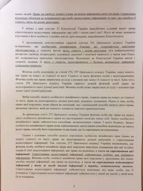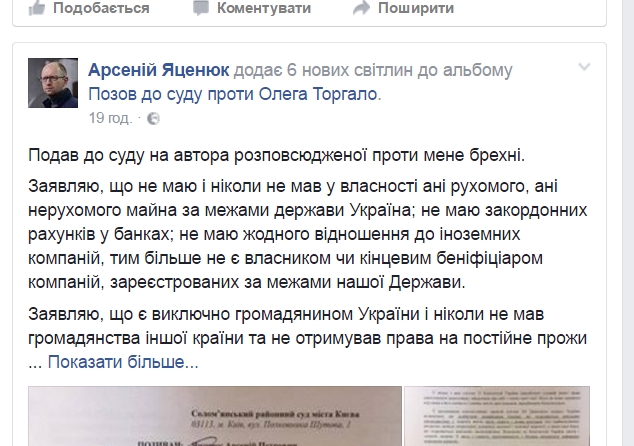 Вместе с тем политик опубликовал на своей странице копию соответствующего искового заявления, в котором указывается, что распространенная Торгало информация является неправдивой, недостоверной, унижающей честь, достоинство и деловую репутацию истца.