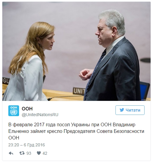 "В феврале 2017 года посол Украины при ООН Владимир Ельченко займет кресло председателя Совета Безопасности ООН", - говорится в заметке.