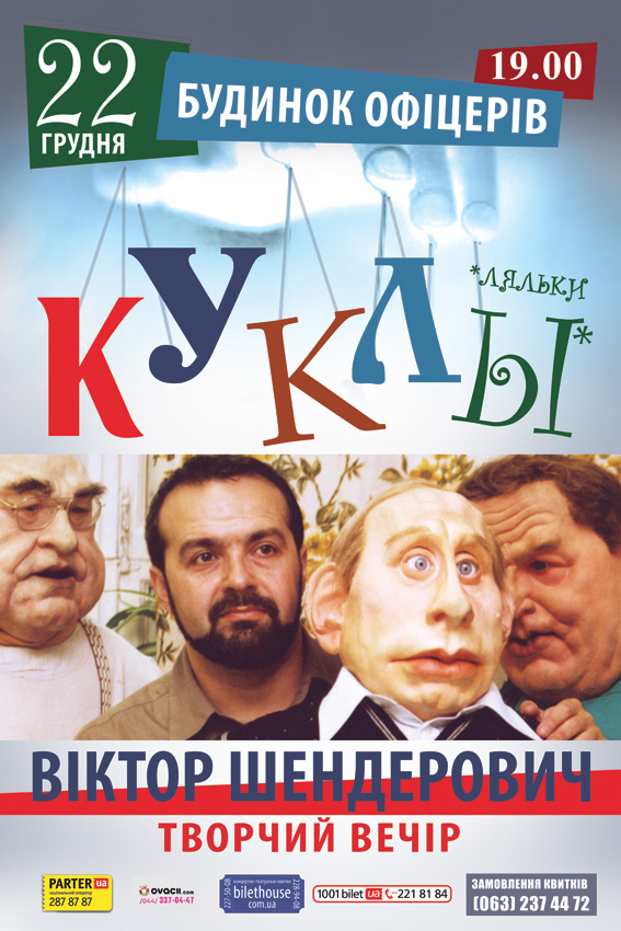 Продюсерський центр ЕТУАЛЬ представляє 22 грудня російський ліберал, письменник-сатирик, колумнист, теле- та радіоведучий, а також просто розумна й тонка людина Віктор Шендерович. «КУКЛИ»/«ЛЯЛЬКИ». 20 РОКІВ ПОТОМУ.