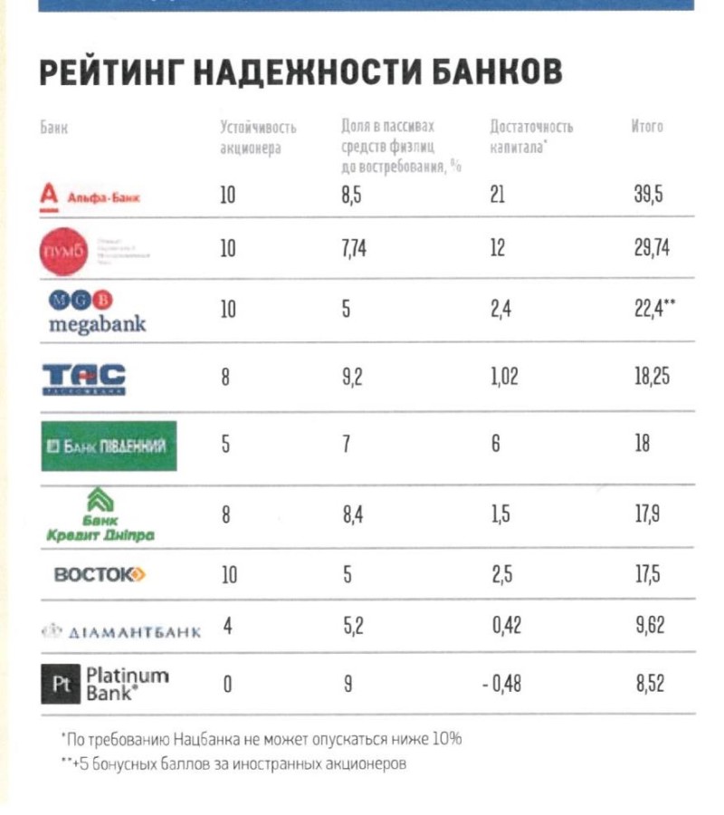 В итоге на первом месте оказался Альфа-банк. У него и соглашение об обмене акциями с крупнейшей итальянской банковской группой Уникредит. И 14,8 млрд гривен депозитов физлиц, и только 15% из них – до востребования (их могут забрать в любой момент). При этом акционер банка – способен предоставить ему финансовую помощь и получить рефинансирование в НБУ. Капитал банка также один из самых высоких среди анализируемых частных банков – почти 7 млрд. грн.