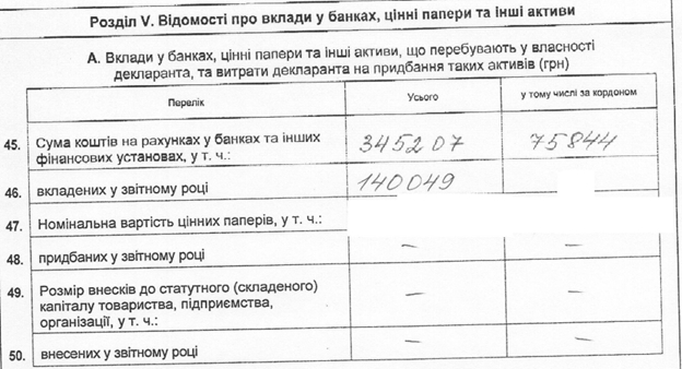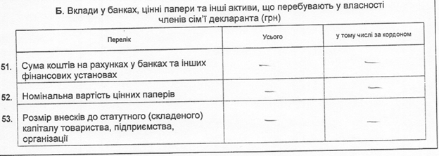 А нижче є дані про цінні папери членів сім’ї декларанта, де в рядку номінальна вартість цінних паперів вказано на… повну відсутність таких цінних паперів.