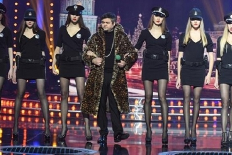 Во время концерта, который снимали три недели назад для новогоднего эфира "1+1", показали очень смешной номер о министре МВД Арсене Авакове, которого играл Юрий Крапов, одетый в шубу, с золотыми цепями и в окружении девушек.