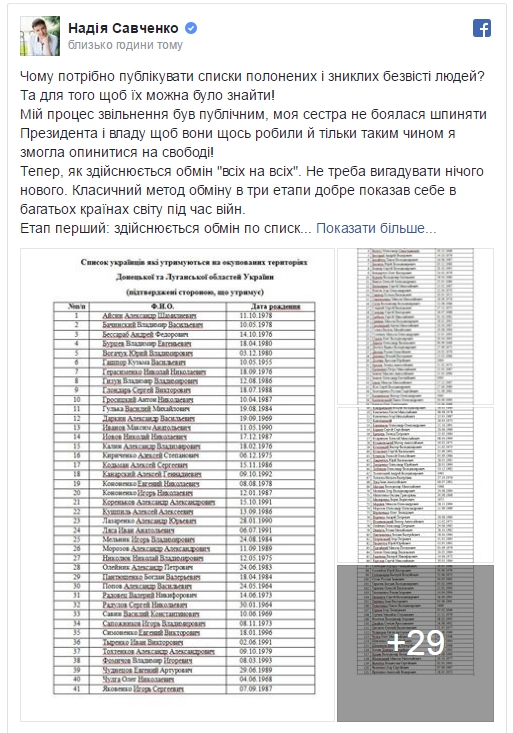 "Почему нужно публиковать списки пленных и пропавших без вести людей? Для того чтобы их можно было найти!" – написала депутат в своем Facebook.