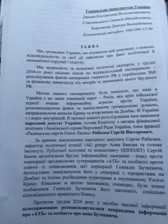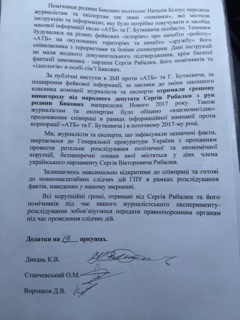 «Метою нашого експерименту було показати, що нині в України є не лише зовнішній ворог – Росія, яка здійснює інформаційну агресію проти України, розповсюджуючи «фейки» та маніпулюючи громадською думкою, виправдовуючи анексію Криму та вторгнення на Донбас. В України є і ворог внутрішній. В процесі нашого розслідування ним виявився народний депутат України, голова Комітету з питань фінансової політики та банківської діяльності Верховної Ради, член фракції «Радикальна партія Олега Ляшка» Рибалка Сергій Вікторович», - йдеться в заяві, яку активісти передали до Генеральної прокуратури.
