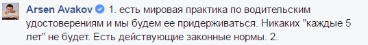 "Есть мировая практика по водительским удостоверениям и мы будем ее придерживаться. Никаких "каждые пять лет" не будет. Есть действующие законные нормы", - пояснил Аваков.