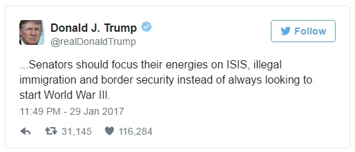 "Сенаторы должны сосредоточить свои усилия на борьбе с ИГИЛ, нелегальной миграции и пограничной безопасности вместо того, чтобы искать возможность начать Третью мировую войну", - написал Трамп.