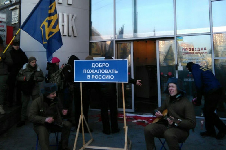 К примеру, у отделения российского банка VTB, которое расположено на бульваре Тараса Шевченко в Киеве, протестуют около трех десятков человек. Активисты заклеили все окна банка листовками "Добро пожаловать в Россию!"