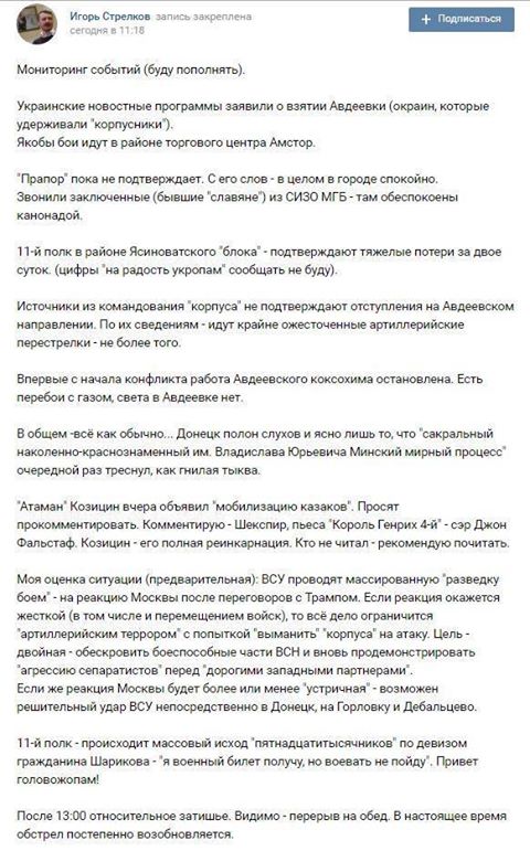 Об этом на своей странице в Facebook сообщил журналист Юрий Бутусов. Так, сотрудник ФСБ и бывший "министр обороны ДНР" Игорь Гиркин рассказал о панических настроениях в рядах боевиков под Авдеевкой. "11-й полк - происходит массовый исход "пятнадцатитысячников" по девизом гражданина Шарикова - "я военный билет получу, но воевать не пойду" - говорится в сообщении Стрелкова в соцсети.