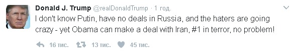 "Я не знаю Путина, у меня нет сделок в России, и ненавистники сходят с ума, при этом Обама может заключать сделки с Ираном, "террористом номер один", и никаких проблем!" - написал он.