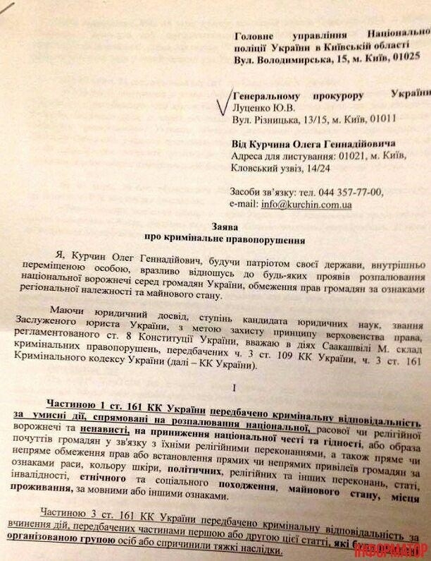 "Разжигание национальной вражды, то есть действия Михеила Саакашвили могут привести к тому, что настраивают народ Одессы, Киева, Донецка, Луганска один против другого", – отметил правозащитник.