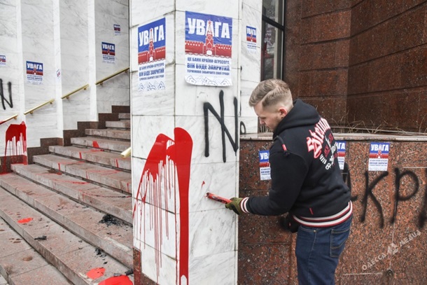 Также на стенах здания активисты оставили надписи "Смерть российским банкам", "Гонтарева гори в аду", "Оккупанты", "Закрыть!".