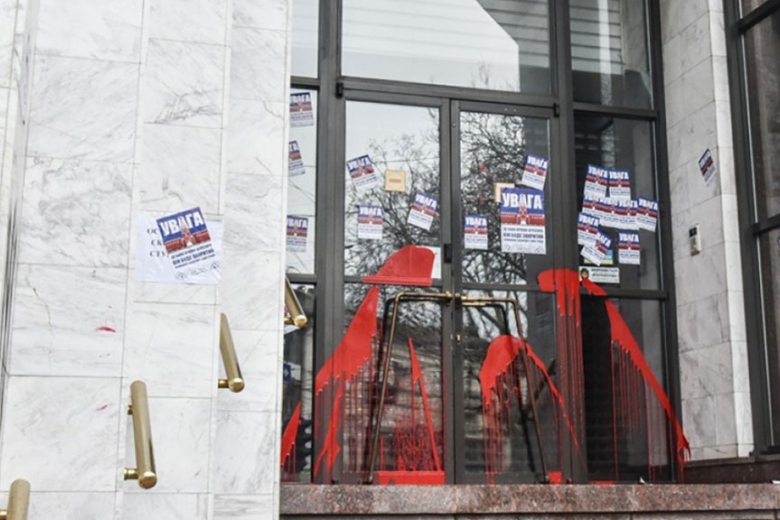 Участники протеста облили красной краской входные двери банка, жгли дымовые шашки и обклеили листовками стены. На листовках была изображена башня Кремля и написано, что Проминвестбанк принадлежит стране-агрессору и скоро будет закрыт.