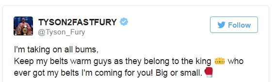 «Я буду драться со всеми мешками. Держите мои пояса тепленькими, ребята, ведь они принадлежат королю! У кого бы ни были мои пояса, я иду за вами! Большими или маленькими», – написал Тайсон Фьюри.