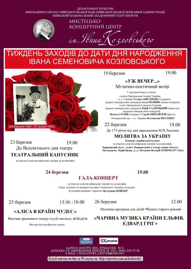 С 19 по 26 марта в филиале Национальной оперетты Украины - Центр им. Ивана Козловского (г.Киев, ул. Крещатик, 50-Б) - состоится Неделя мероприятий, посвященных Дню рождения Ивана Семеновича Козловского. В многообразной программе недели каждый зритель найдет для себя интересный спектакль или концерт.