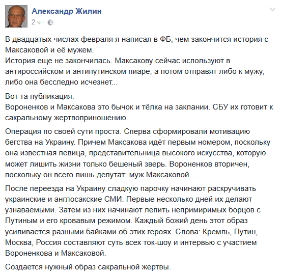Жилин заявляет, что выступает с подобным предупреждением с одной целью - попытаться спасти, прежде всего, Максакову. "Максакова идет первым номером, поскольку она известная певица, представительница высокого искусства, которую может лишить жизни только бешеный зверь. Вороненков вторичен, поскольку он всего лишь депутат, муж Максаковой", - отметил росийский аналитик.