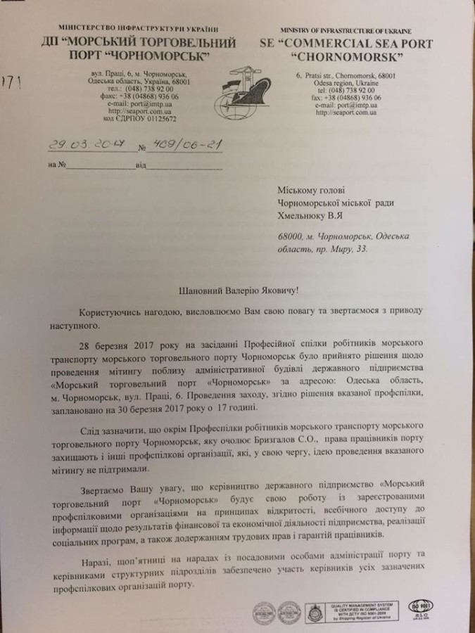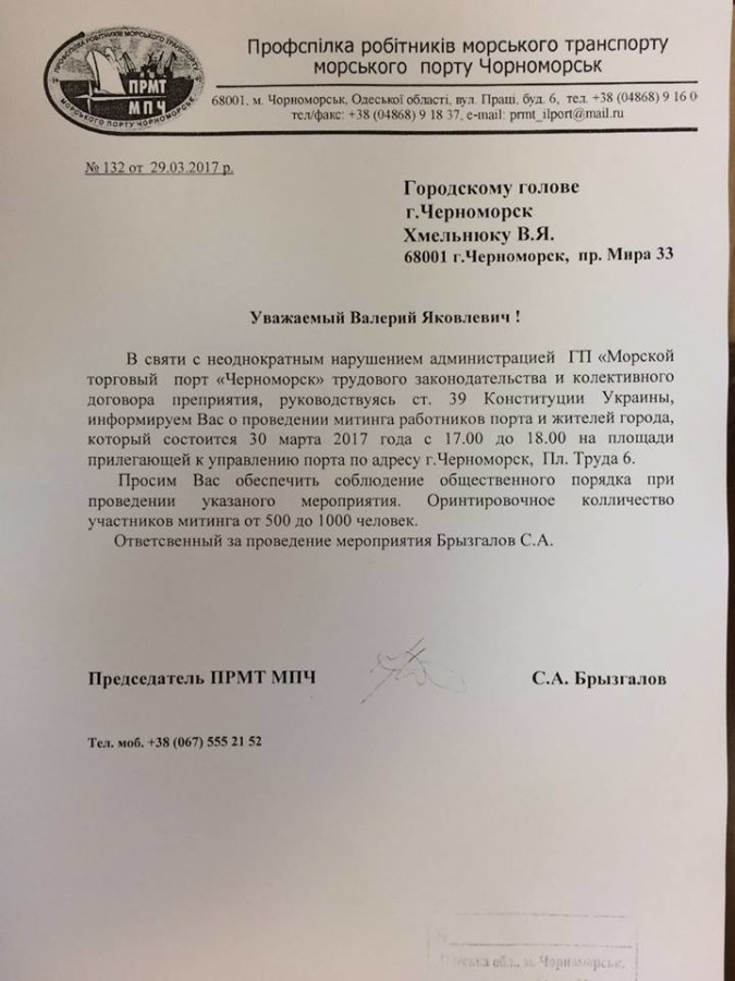 30 марта работники государственной стивидорной компании планируют провести митинг и обсудить критическую ситуацию на предприятии. Директор Черноморского порта Сергей Крыжановский серьезно испугался мирного митинга портовиков, которые будут требовать его увольнения и немедленно оформил на эту дату командировку.