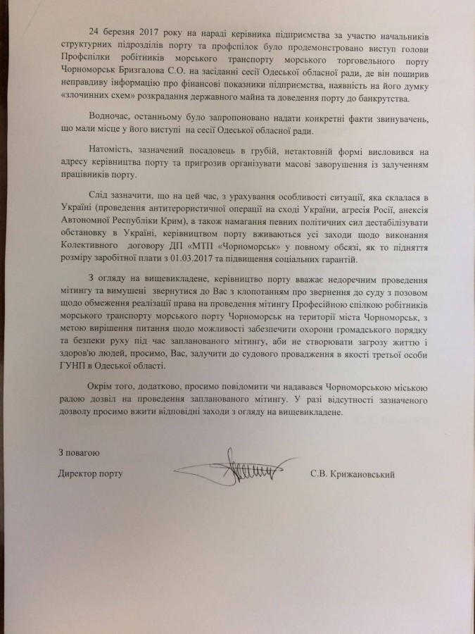 Лидера профсоюза предприятия Сергея Брызгалова, как представителя 2500 членов трудового коллектива, директор также пытался запугивать и обвинять. Накануне Брызгалов выступил на сессии Одесского облсовета и проинформировал депутатов о нанесении руководством порта ущерба государству – трехкратном падении грузооборота, убытках на предприятии с минусовым финрезультатом в 15,5 млн. грн. за первые два месяца 2017 года, безвозвратно утерянных в «Платинум банке» более 100 млн. гривен, незаконных увольнениях и других нарушениях, совершенных Сергеем Крыжановским на посту директора порта «Черноморск». http://izvestia.kiev.ua/item/show/97861