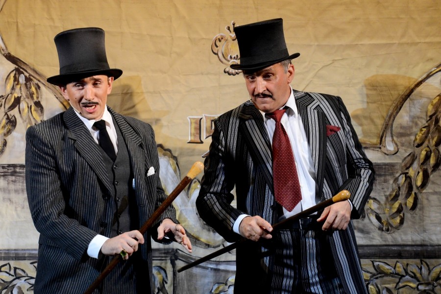 Актеры тут же - на сцене - выясняют личные отношения: поднимается скандал, занавес падает, дирижер пытается спасти ситуацию громкой музыкой, однако шум и крики выдают закулисную драку...