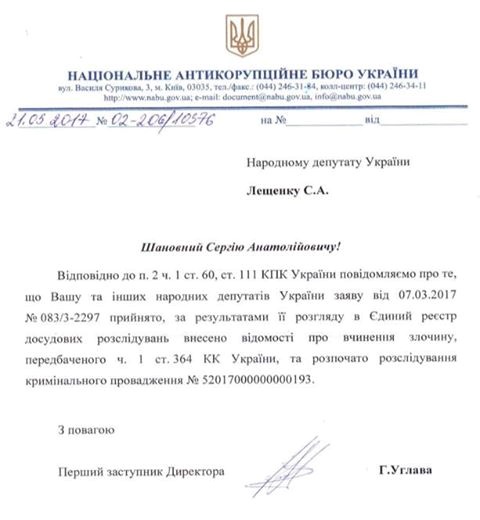 В ответ на обращение Бюро сообщило, что заявление принято и по результатам его рассмотрения в Единый реестр досудебных решений внесены сведения о совершении преступления, предусмотренного ч.1 ст.364 Уголовного кодекса Украины, и начато уголовное производство.